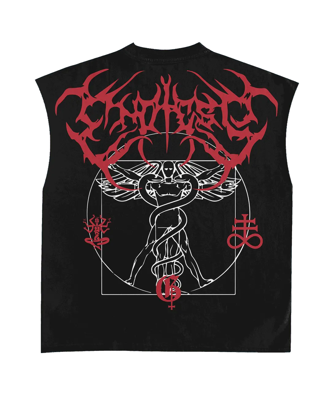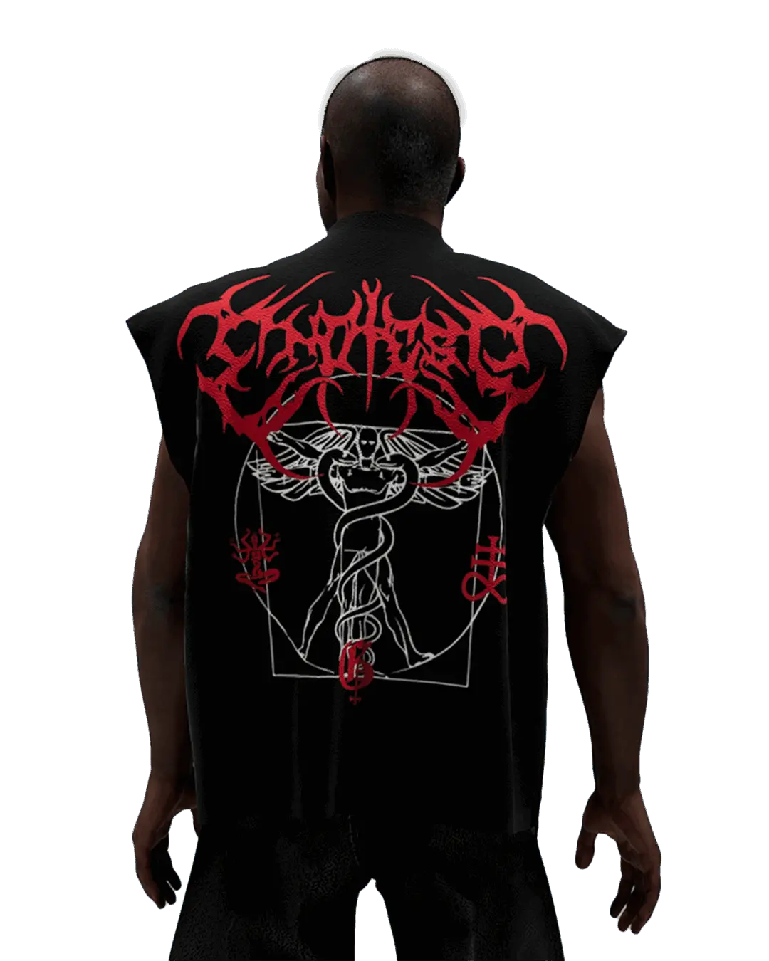 Striking oversized vest featuring bold occult graphics and gothic script, perfect for alternative streetwear statements.