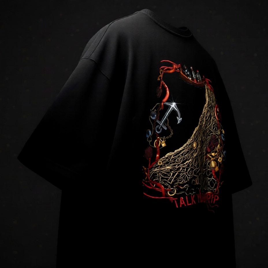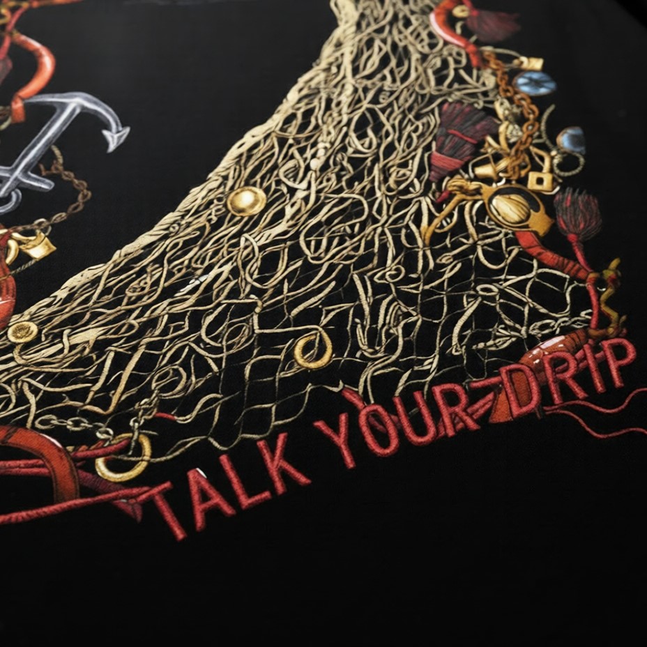 Bold maritime-themed tee featuring intricate fishing net design with vintage anchor and boat motifs in premium puff print.