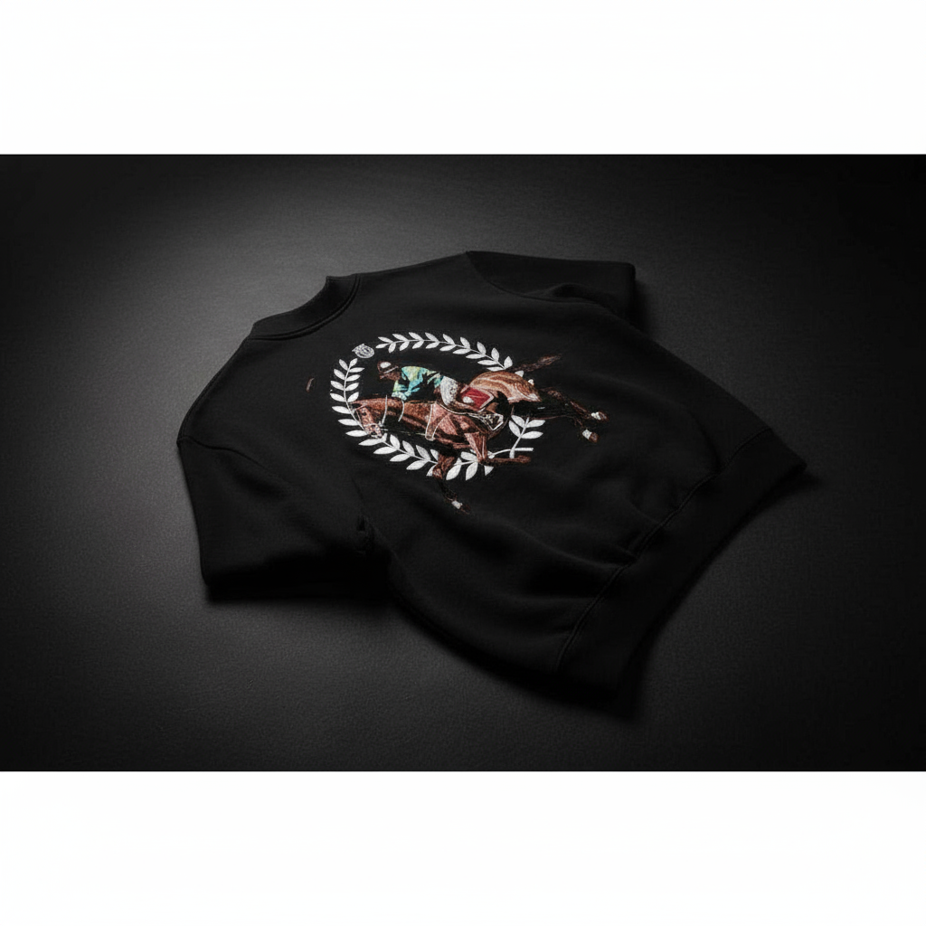 Premium black sweatshirt featuring detailed embroidered horse rider with laurel wreath design and signature geometric branding.