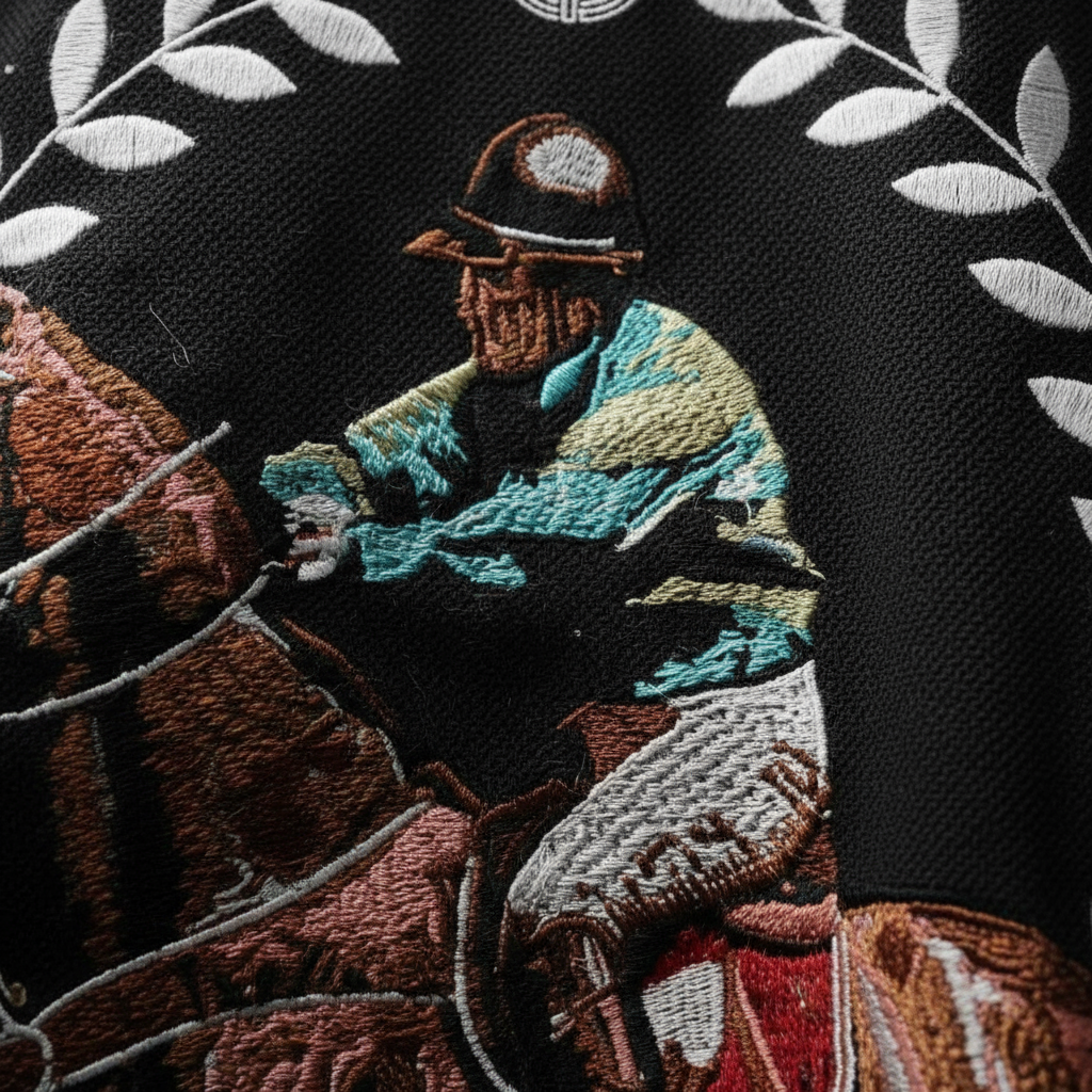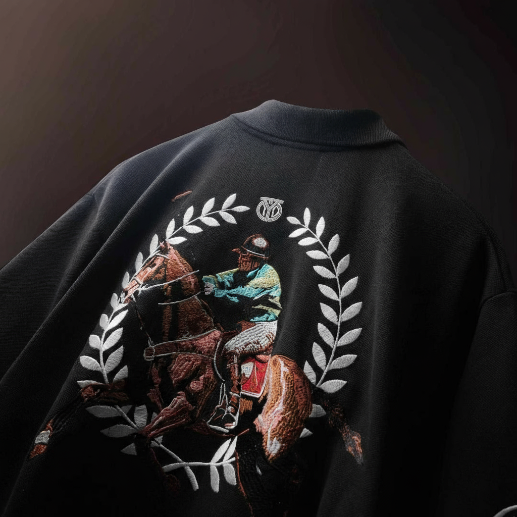 Heritage Craftsmanship – Intricately embroidered horse rider scene with traditional polo attire
